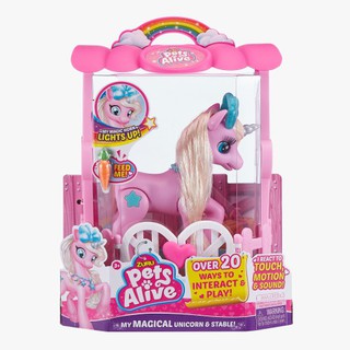 Zuru pets alive s new my magical unicorn over 20 ways to interact play. When you talk to her she moves her head and hoof makes sounds and lights up her horn so you can tell she s listening. It comes with stable and a carrot. With over 20 different ways to interact and play these magestic characters are filled with life and love.